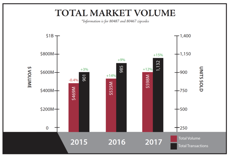 2017 was a very healthy year for the Steamboat Springs real estate market; in fact, it was the most robust year since 2007, right before the housing bubble and recession. Overall market volume in Steamboat and surrounding areas was up 12% to $598M in sale